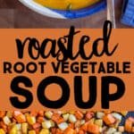 - Add the roasted root vegetables into the pot and stir everything together well. Pour in the vegetable broth and bring the soup to a low simmer. Once simmering, turn the heat off and you can either use an immersion blender right in the soup pot, or you can add everything to a blender, or food processor, and blend until completely smooth. Remember that the soup is hot, so make sure to be careful, whichever method you use. The soup can also be blended in batches, if needed.