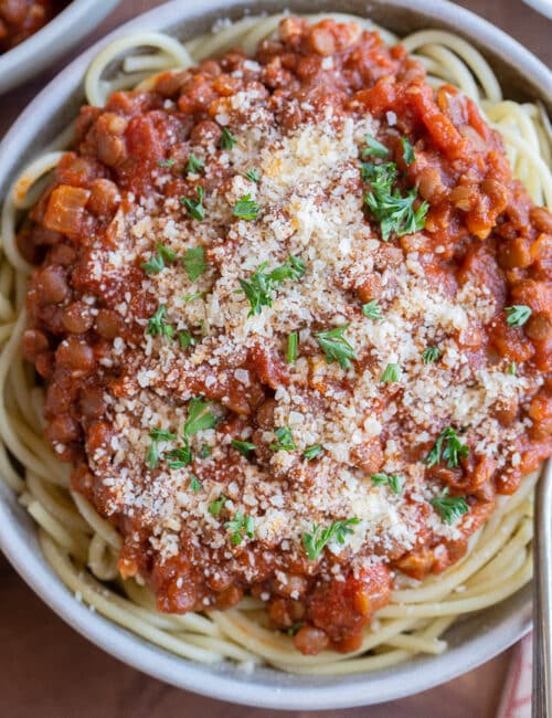 My Spaghetti with Meaty Lentil Sauce is a nutrient-packed vegetarian dinner that comes together quickly. This hearty pasta recipe is a great,