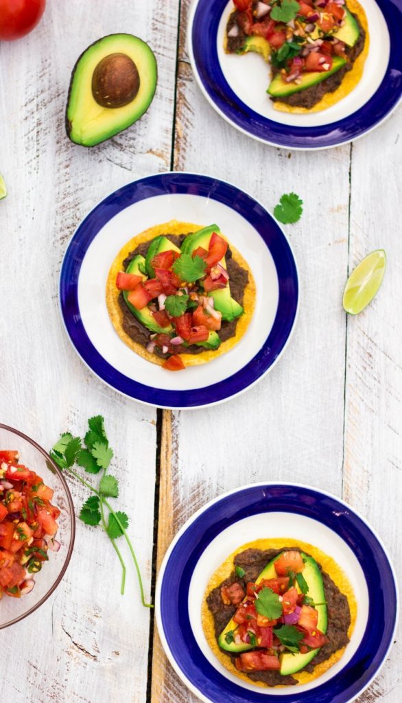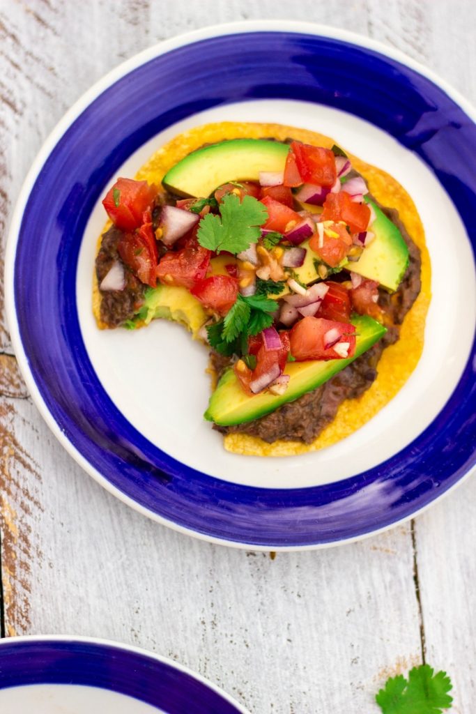 These Easy Black Bean Tostadas are topped with homemade refried beans and fresh pico de Gallo and avocado. They’re fresh, flavorful and perfect for lunch or dinner!