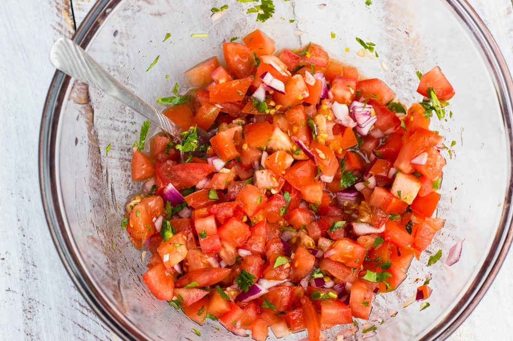 - While tortillas are in the oven, in a small bowl, add all pico de gallo ingredients and mix together. Place in the refrigerator until ready to use.