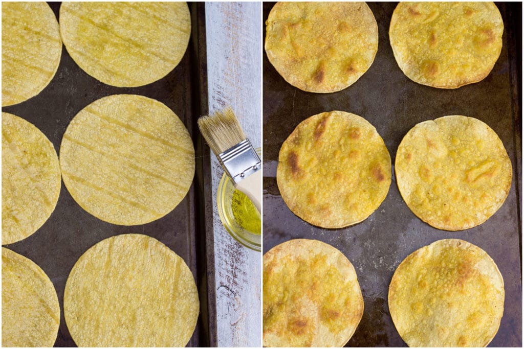 - Brush both sides of the corn tortillas with a small amount of olive oil and place onto a large sheet pan. Place in the oven and bake for about ten minutes, until they are crispy. Flipping halfway. Set aside.