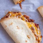 - Lay out the flour tortillas on a large sheet pan lined with parchment paper. For each taco: add 1-2 tablespoons shredded cheese on one side, top with about 1/4 cup of the lentil mixture and then finish off by adding on 1-2 more tablespoons shredded cheese to the top.
