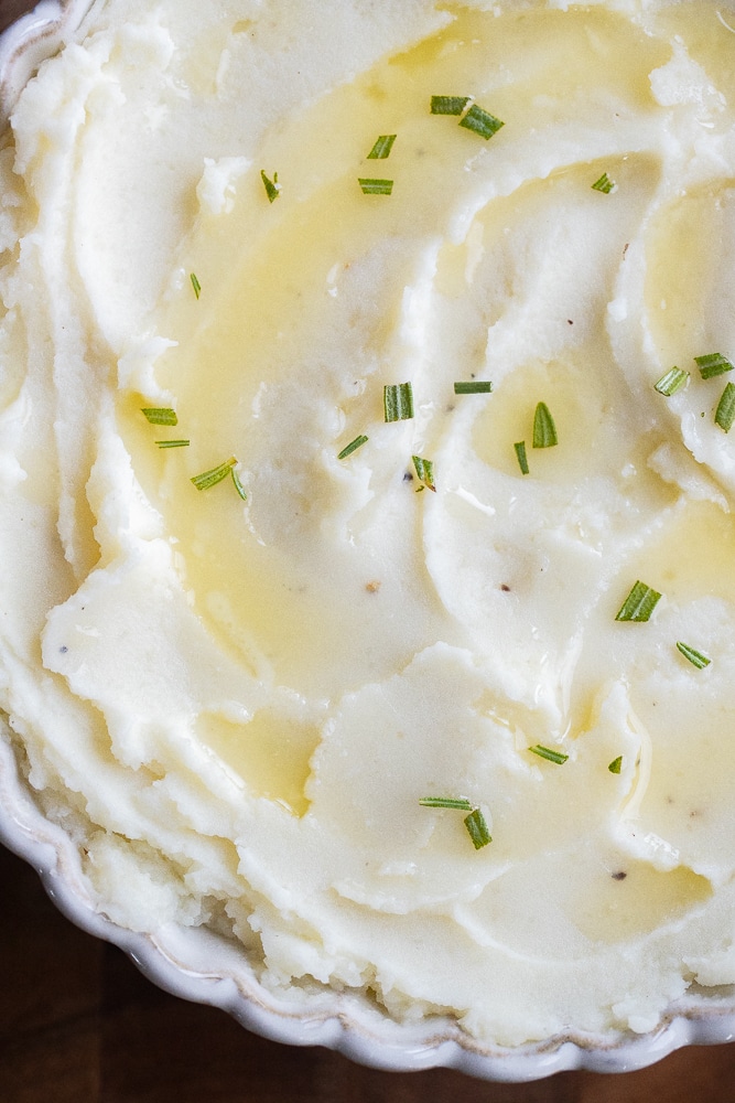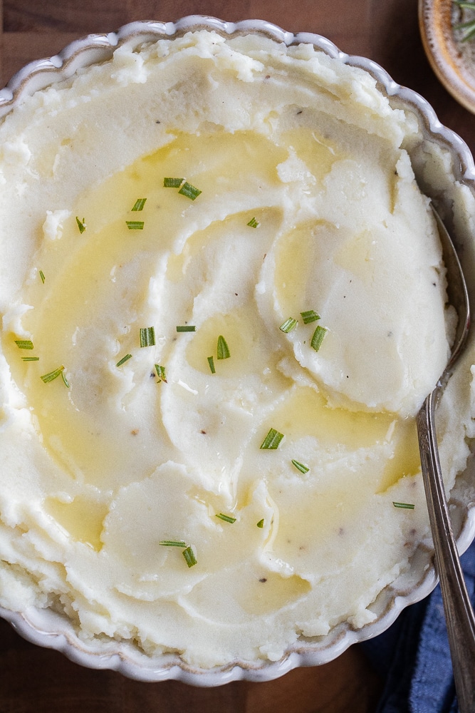 - Don’t over boil the potatoes – I used to think it would make the mashed potatoes creamier if I boiled them until falling apart, but it actually can water log them, creating mashed potatoes that have too much water in them and not much flavor. Cook until the first sign that the fork can easily pierce through the potato.