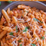 - Easy to make – Pasta is always a great option when you’re looking for an easy dinner recipe. The pasta cooks up quickly and the creamy red sauce can be prepared during that time. Just toss the cooked pasta and white beans into the sauce and serve with salad and garlic bread for a hearty dinner.