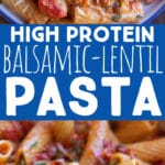 My Easy Balsamic Lentil Pasta comes together quickly and uses a lot of pantry staples. The tomatoes add a fresh summer kick to this cozy and filling vegetarian pasta recipe. Lentils are packed with protein and fiber, making them a great plant based “meaty” addition to this healthy pasta dinner. Serve with salad and bread for a full meal.