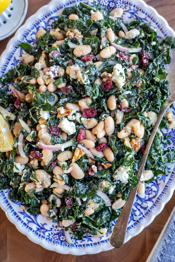 - Great potluck dish – When planning a recipe to bring to a potluck, I like to bring something light and refreshing, but also hearty and filling. This Kale and white bean salad checks all of those boxes. The dressing is bright and zippy, while the goat cheese and white beans add protein to fill you up.