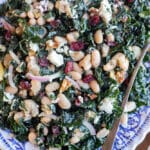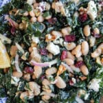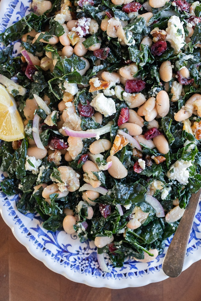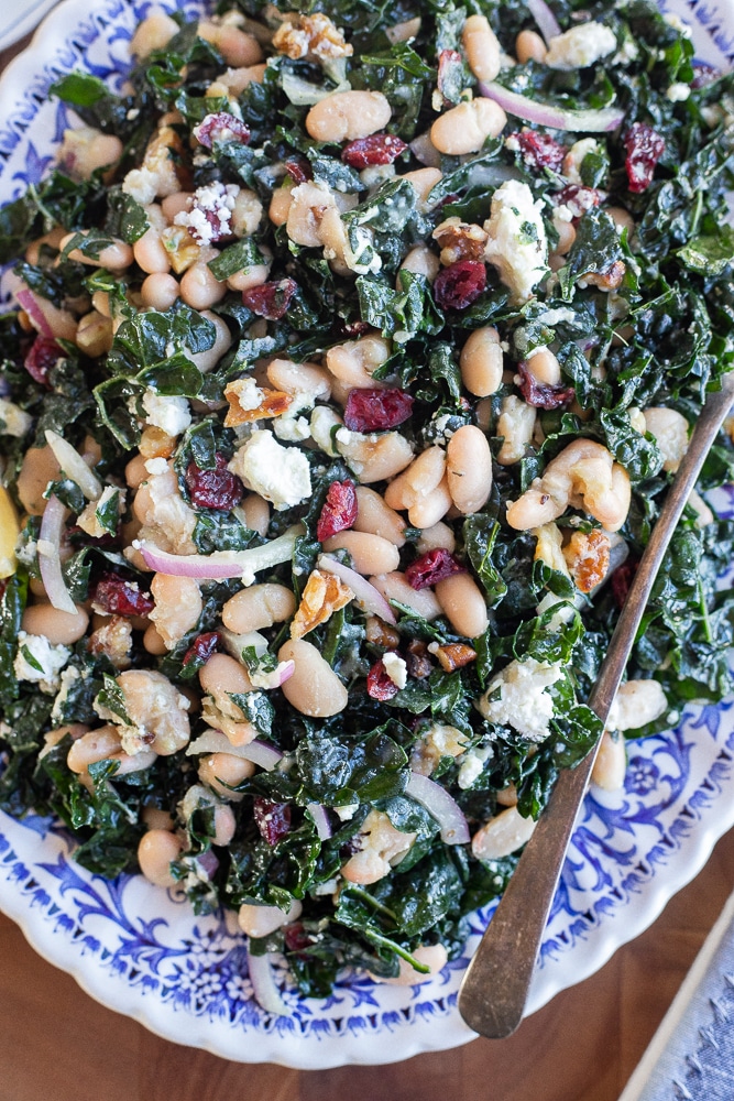 My Easy Kale and White Bean Salad comes together quickly and is packed with tons of nutritious ingredients. The kale gets massaged with a flavorful homemade dressing for perfect texture and then the salad gets loaded up with hearty white beans, goat cheese, dried cranberries and toasted walnuts. This easy kale salad can be enjoyed for lunch or a health side dish on your holiday table this year.