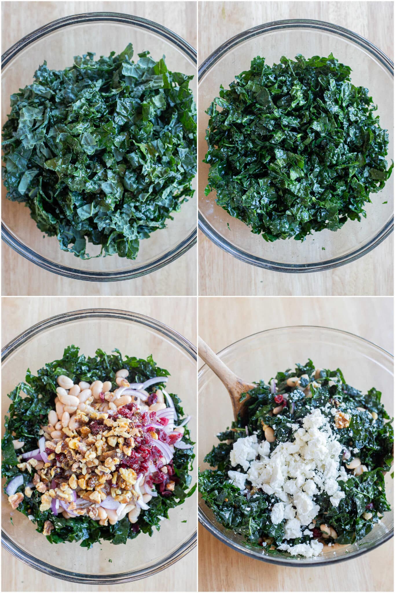- Next, add in the white beans, red onion, dried cranberries and walnuts. Mix the salad together well and then add in the crumbled goat cheese and any extra dressing needed. Carefully mix salad together again and serve immediately or chill in the refrigerator until ready to eat. Season with any extra salt or pepper needed.