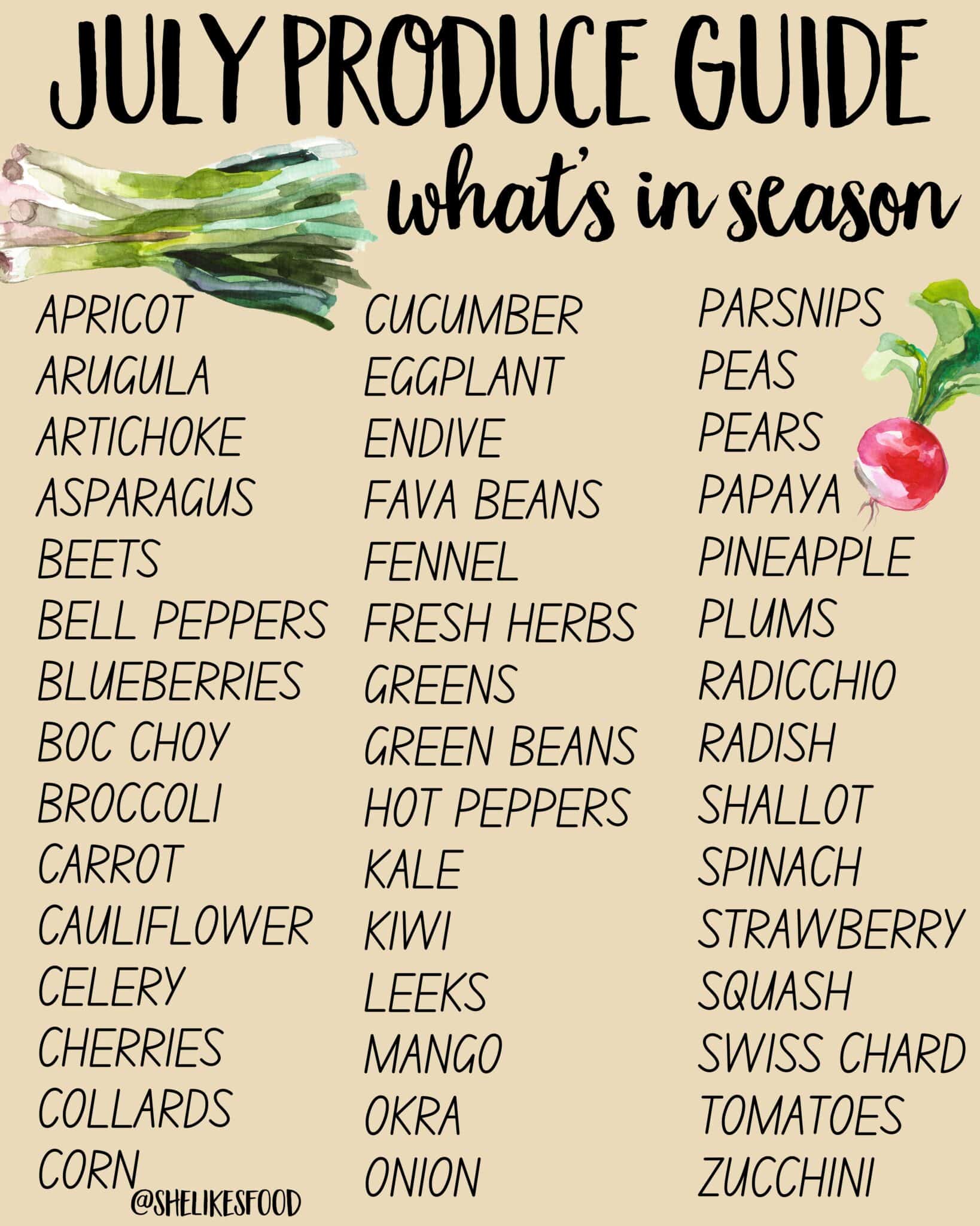 Welcome to my July Produce Guide! It’s (almost) July and the kids have settled nicely into a lazy summer routine and we just got our first big summer rainstorm a few days ago. Our neighborhood goes under water restriction each summer, so I’m always thankful for extra rain. We’ve been trying to go to swimming as much as possible and we have a fun family vacation coming up soon. July is one of the best months to visit your local farmer’s market, because depending on where you live, it is probably bursting with fresh tomatoes, zucchini and flowers, among much more.