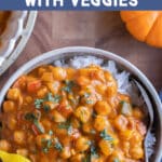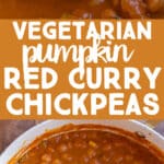 - Add in the chickpeas and then pour the sauce over. Mix veggies, chickpeas and sauce together well until fully combined. Allow sauce to come to a simmer and cook everything together for about 5 minutes, stirring occasionally. Serve pumpkin red curry with chickpeas and vegetables over rice, or grain of choice.